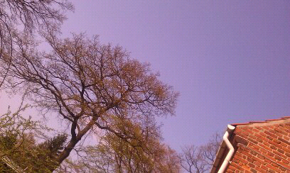 I havens fjerneste ende står et skønt troldhassel træ, lige nu med fine spæde blade.